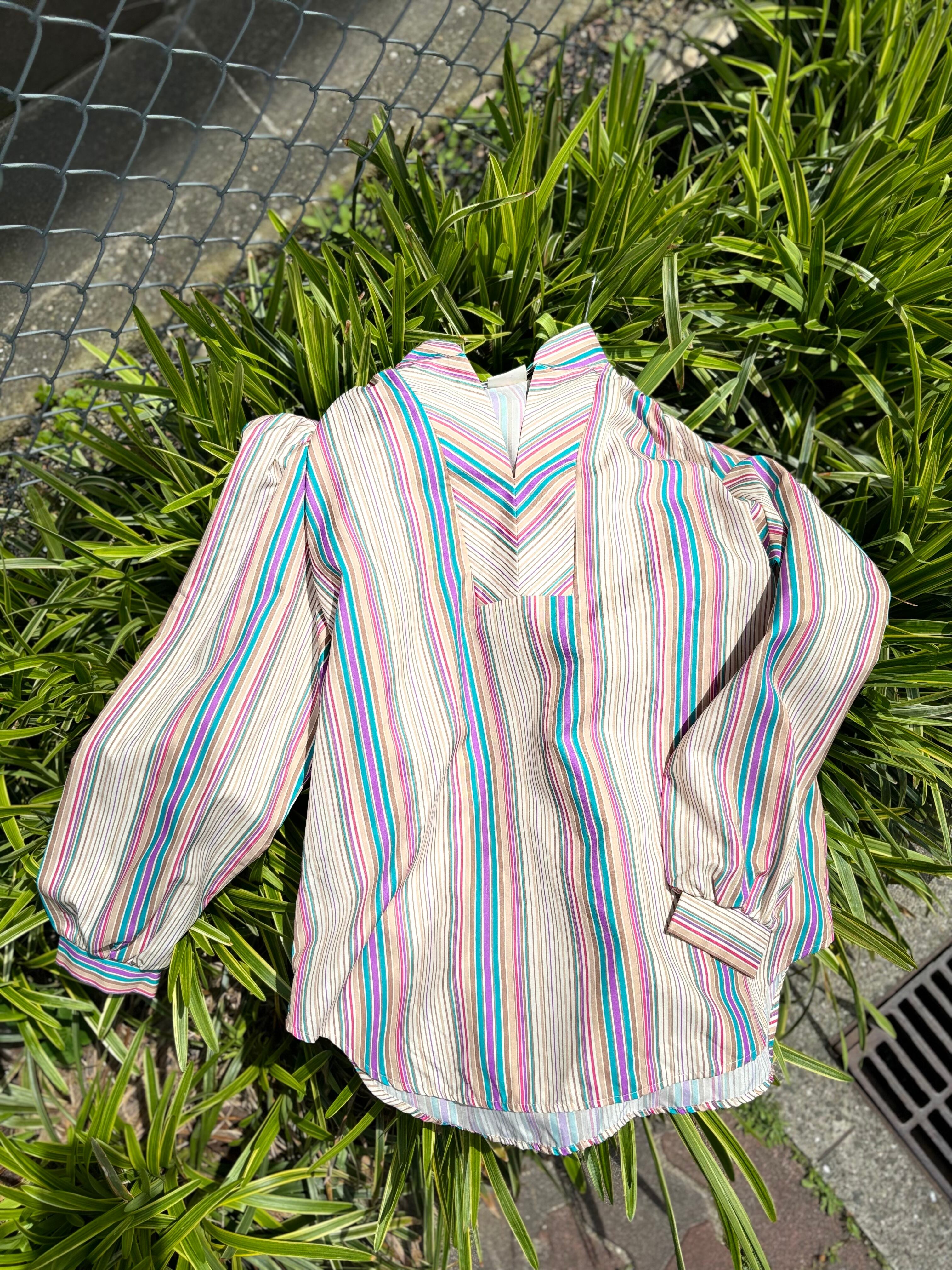 配色が最高に可愛いストライプと襟無し、前開でさりげなくインナーで見せれます。